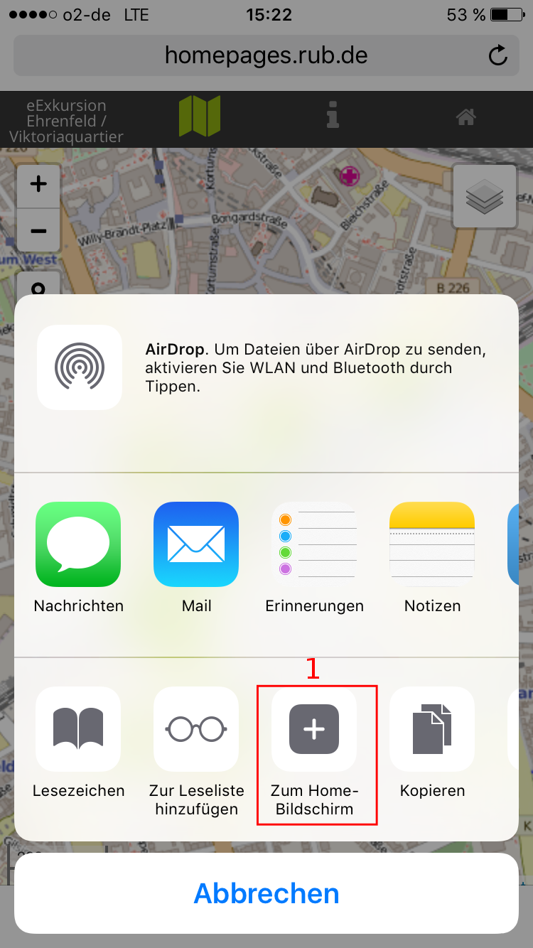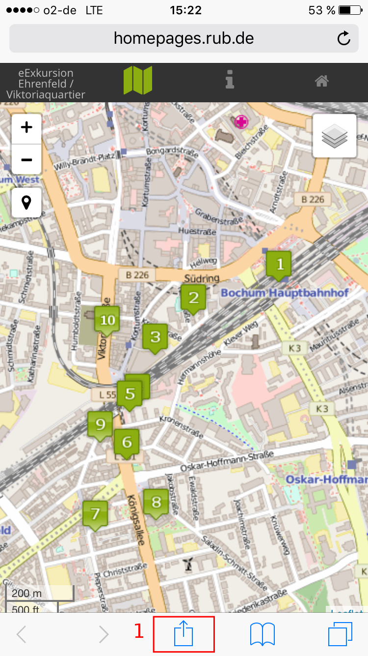 Auch unter iOS gibt es geringfügige Einschränkungen. So ist der Standardbrowser unter iOS (mobile Safari) nicht in der Lage, die Exkursionsapplikation (nicht die Startseite und Dokumentation) ohne weiteres im Vollbildmodus darzustellen. Im folgenden ist ein kleines Workaround beschrieben, wie sie die Applikation auch auf Apple-Geräten im Vollbild genießen können: Dazu rufen Sie die Startseite wie gewohnt im Safari auf und wählen anschließend die Exkursion, welche sie durchführen wollen. Ist die Seite geladen, wird Ihnen auffallen, dass die App am unteren Rand abgeschnitten und somit die untere Navigationsleiste nicht erreichbar ist. Um diesen Fehler zu umgehen müssen Sie einen Link auf den Homescreen legen. Die Vorgehensweise ist im weiteren Verlauf mit Hilfe zweier Abbildungen dargestellt.