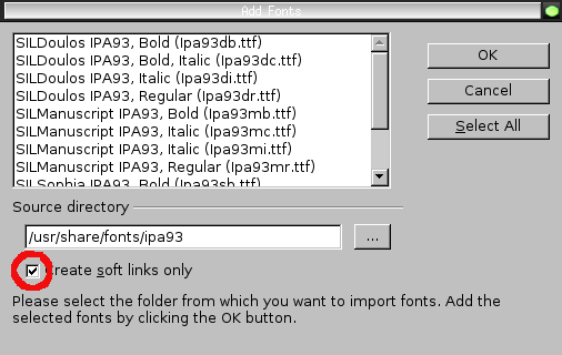 Select All und Create soft links only anwählen. Auf diesem Wege werden die Fonts nicht noch einmal kopiert, sondern nur symbolisch verlinkt... das spart etwas Platz :)