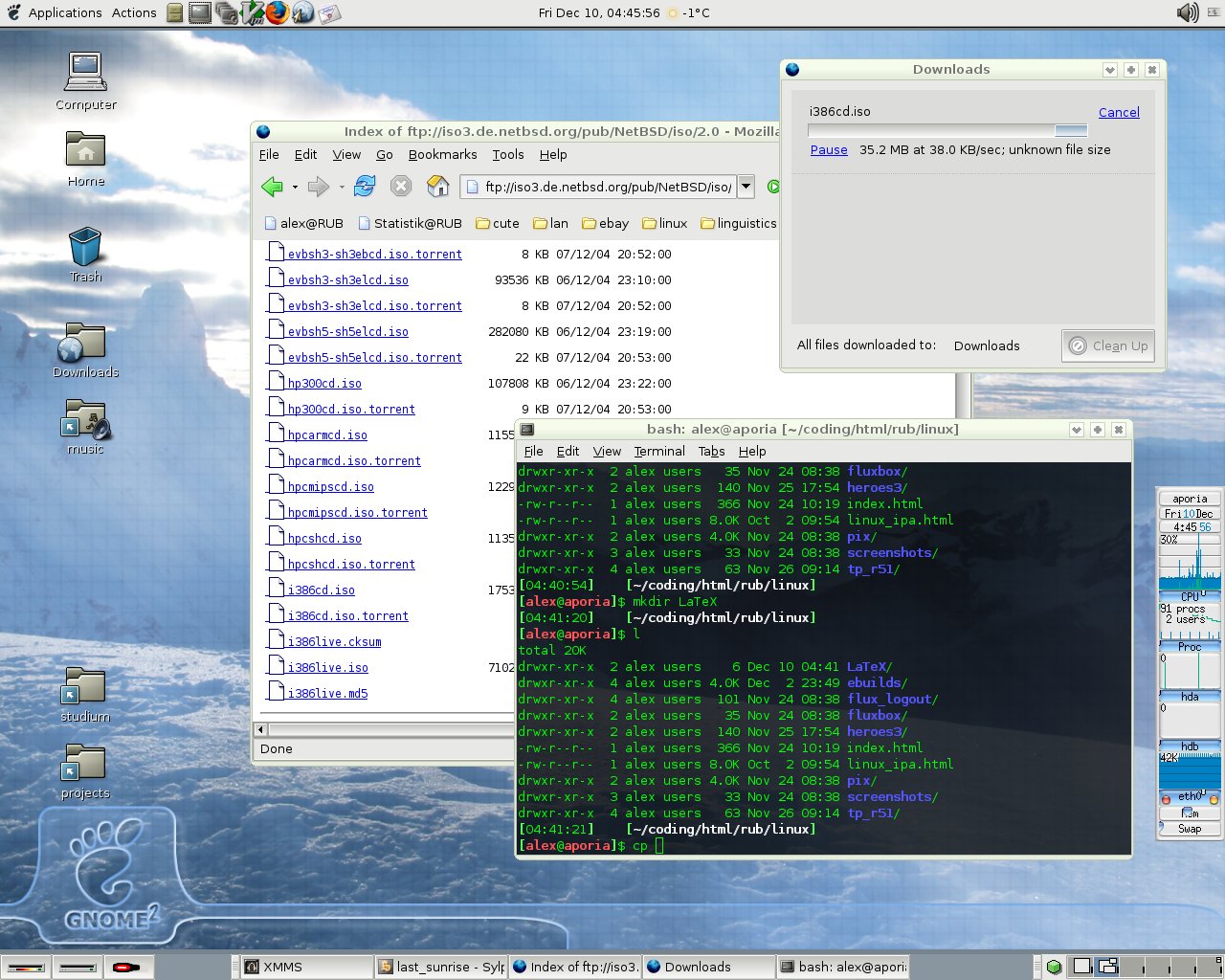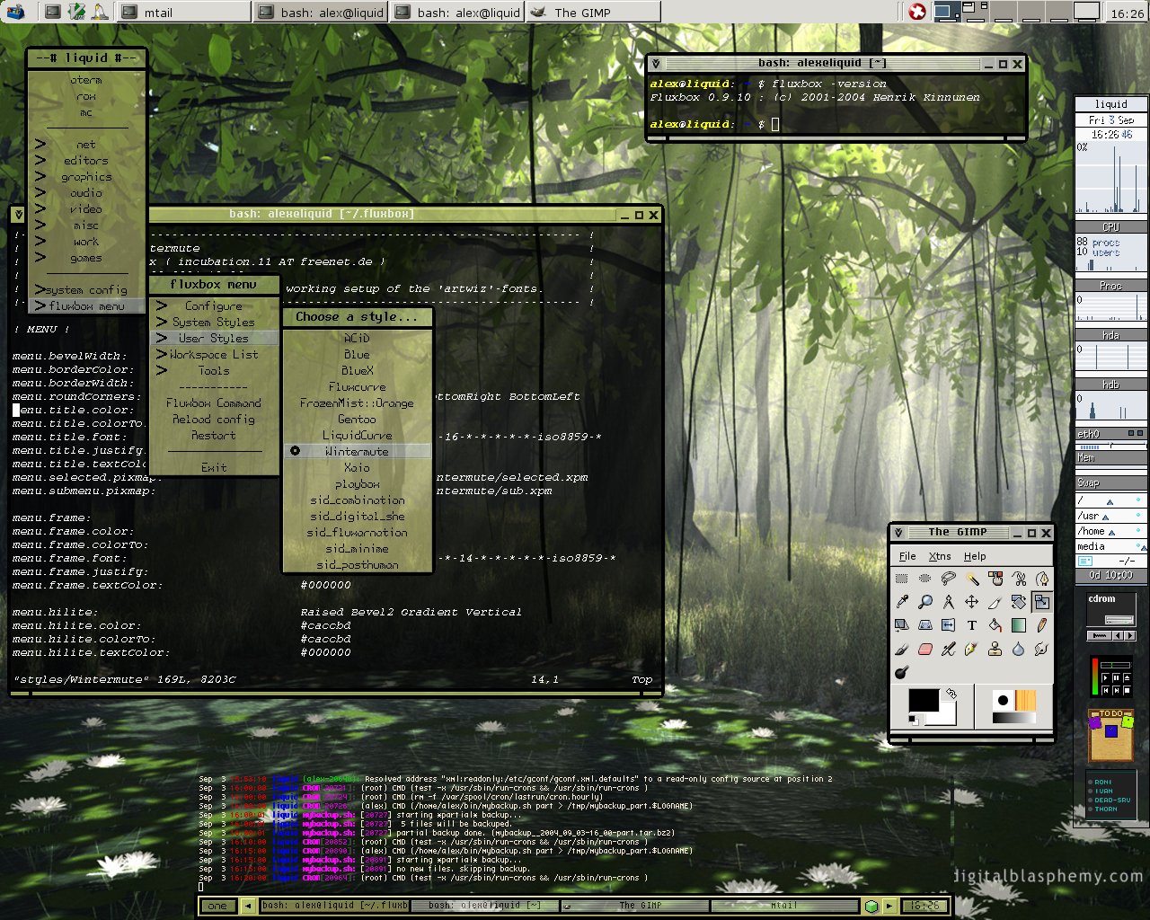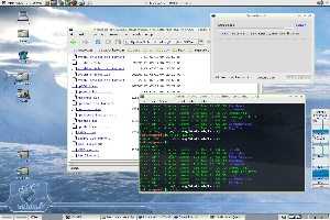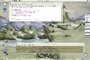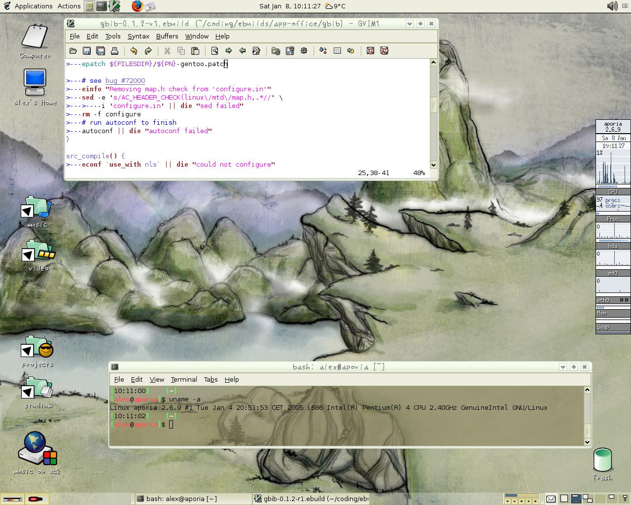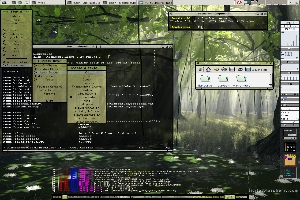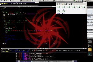 einige transparente aterms, ROX-Filer (LUSH-Theme), gkrellm (prime_23-Theme), mount.app, wmxmms, wmpiki, wmpinboard, mtail, vim, fbpanel mit integriertem Pager, |