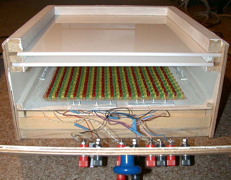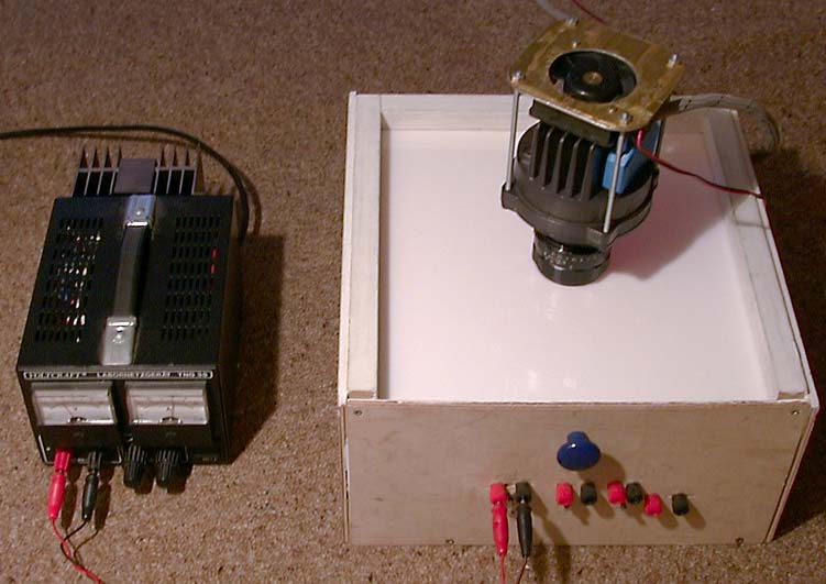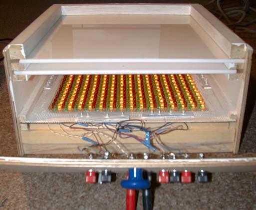 ein Array aus Leuchtdioden in einem Kasten hinter opakem weißem Kunststoff kombinierte Reihen- und Parallelschaltung ca. 10 bis 12 V bei 0.1 bis 1.5 A Betrieb über ein regelbares Netzgerät mit Stromstärkeneinstellung