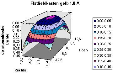 Die Spalten- und Zeilenköpfe geben den Abstand in cm vom Mittelpunkt der Flatfieldbox an. Die Zahlen innerhalb der Tabelle geben die mit einem Durchlichtdensitometer gemessenen Lichtabfall in photographischen Dichten an. Orange hinterlegte Felder werden bei einem Teleskop mit 8" Öffnung benutzt.