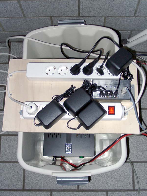 So sieht die Stromversorgungskiste von oben aus. Mit einem verschließbaren Decke ausgerüstet sind hier alle Kabel und Netzteile immer eingesteckt. |