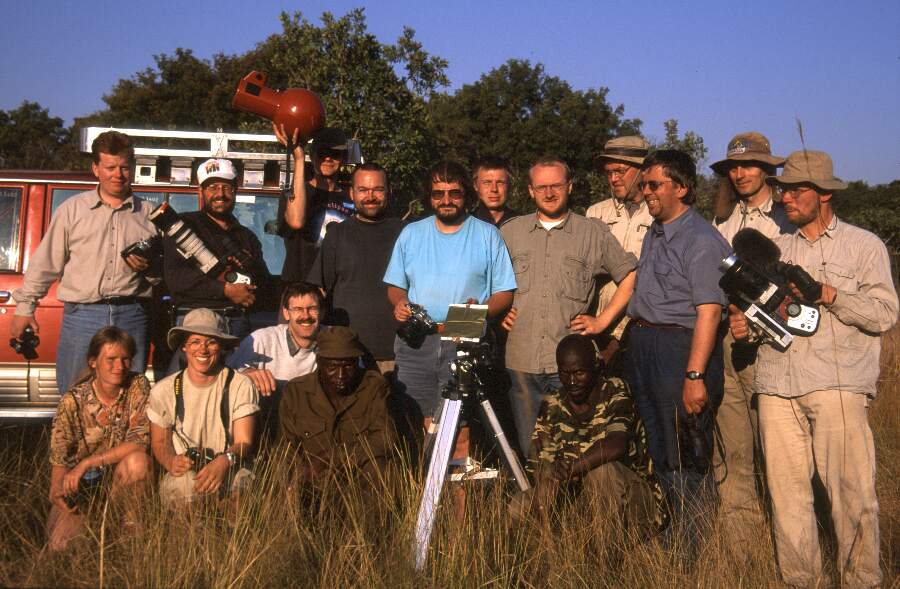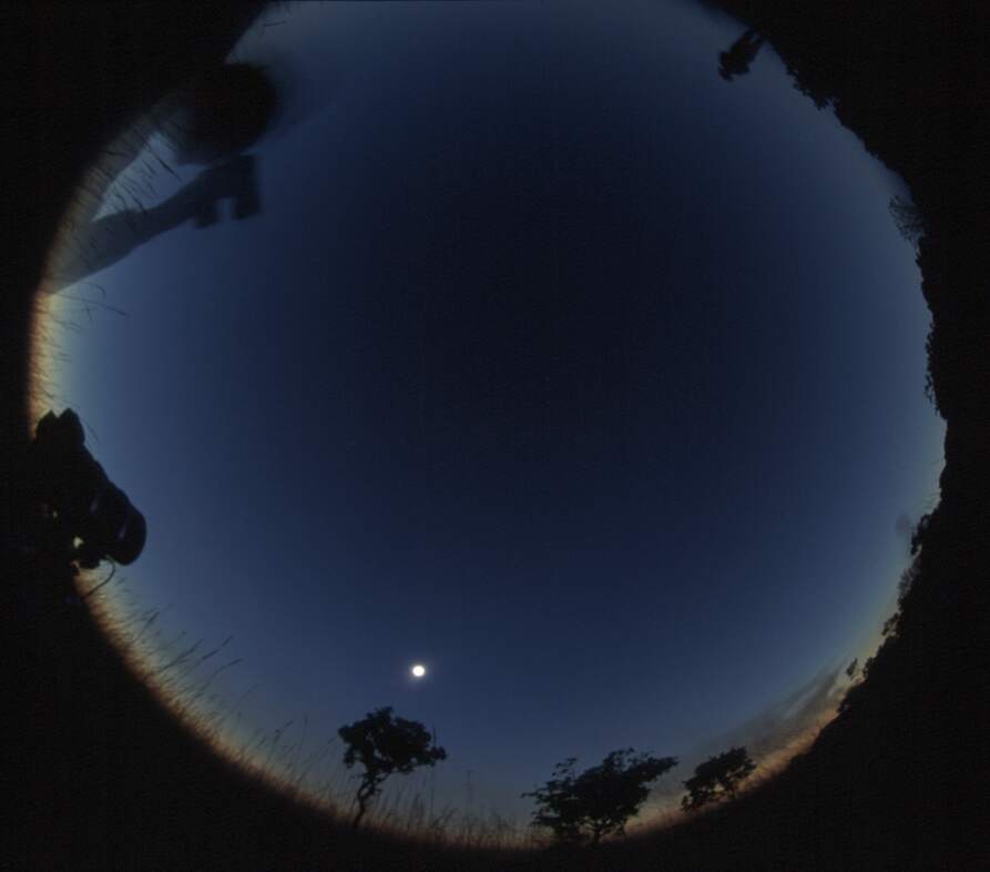 The observation of the total solar eclipse was a complete success for everybody in our group of 14 german amateur astronomers led by Daniel Fischer, Königswinter and the two scouts provided by ZAWA. The sky was perfect clear besides a small patch of smoke from bush fires at the northern horizon (visible in the fish eye image during totality). So even stars of mag 7.2 are visible in the longest exposured slide with the 500 mm lens. We observed from the north western corner of the Kafue National Park in Zambia at 14°02'13.3" S and 25°38'24.0" E. This was about 8 km north of the center line, which yields the longest possible duration of the totality of 3 min 46 sec for the given longitude due to the actual moon rim profile. The images of the eclipsed sun were made through a Maksutov telelens with 1100 mm focal length @ f/10.5, a Sigma APO 170 - 500 mm telelens @ 500 mm (f/8) on a modified old Polaris mount and an 8 mm Peleng Fisheye lens on Fujichrome Velvia (ISO 50). The exposure times varied between 1/250 sec. (contacts) and 30 sec. (corona at mid-eclipse). All images © 2001 Bernd Brinkmann. They may not be used in any form elsewhere without the written permission of the author. |