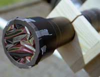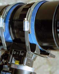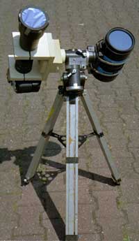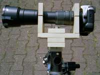 Die Bilder am Ende der Seite zeigen meinen Kamera-Aufbau, wie ich ihn in Bulgarien eingesetzt habe. Auf einer alten Polaris-Montierung sitzt das 1100 mm f/10.5 Maksutov-Spiegeltele (hier während des Testaufbaus zu Hause). Auf der Gegengewichtsseite befindet sich ein Sigma APO-Telezoom (f=170 - 500 mm), das mir 500 mm Brennweite benutzt wird. |