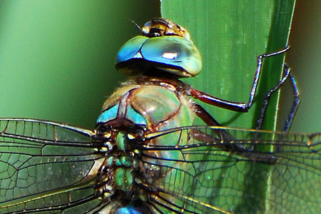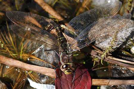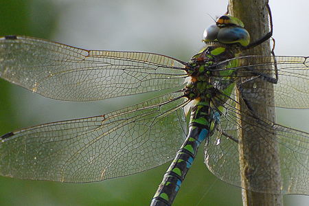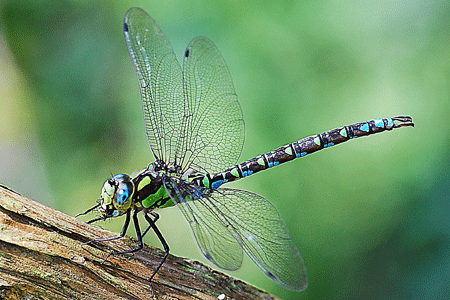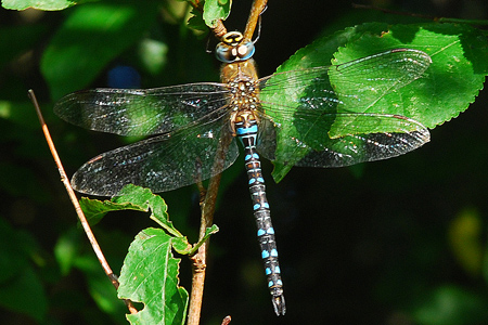 Familie: Edellibellen (Aeshnidae) blaugrüne Mosaikjungfer, Weibchen Aeshna cyanea (Müller, 1764) Flügelspannweite: 95-110 mm |