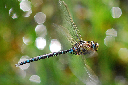 Familie: Edellibellen (Aeshnidae) blaugrüne Mosaikjungfer, Männchen Aeshna cyanea (Müller, 1764) Flügelspannweite: 95-110 mm |
