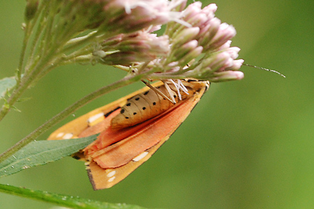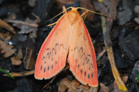 Familie: Eulenfalter (Noctuidae) neu: Bärenspinner (Arctiidae ist jetzt Arctiinae) Rosenmotte Rosen-Flechtenbärchen Miltochrista miniata (Forster, 1771) Spannweite: 23-27 mm |