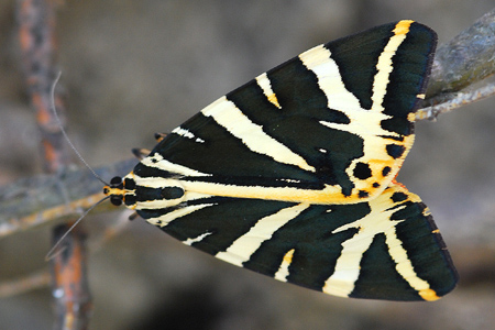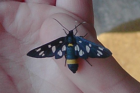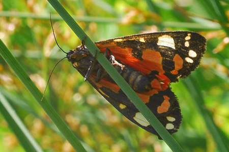 Familie: Eulenfalter (Noctuidae) neu: Bärenspinner (Arctiidae ist jetzt Arctiinae) Weißfleck-Widderchen Amata phegea (Linnaeus, 1758) Synonym: Syntomis phegea Spannweite: 35-40 mm |