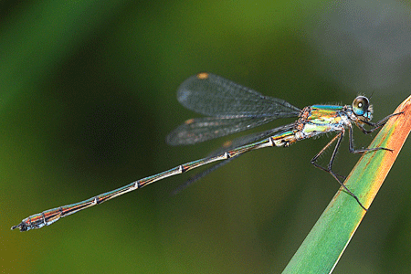 Familie: Teichjungfern (Lestidae) gemeine Weidenjungfer, Männchen Chalcolestes viridis (Vander Linden, 1825) Flügelspannweite: 50-60 mm |