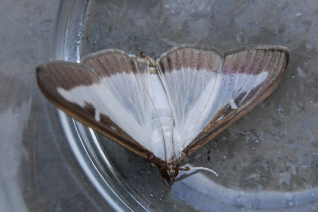Familie: (Rüssel-)Zünsler (Crambidae) Wasserlinsenzünsler Cataclysta lemnata (Linnaeus, 1758) Spannweite: 14-23 mm |