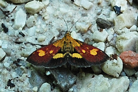 Familie: (Rüssel-)Zünsler (Crambidae) purpurroter Zünsler Pyrausta purpuralis (Linnaeus, 1758) Spannweite: ca. 20 mm |