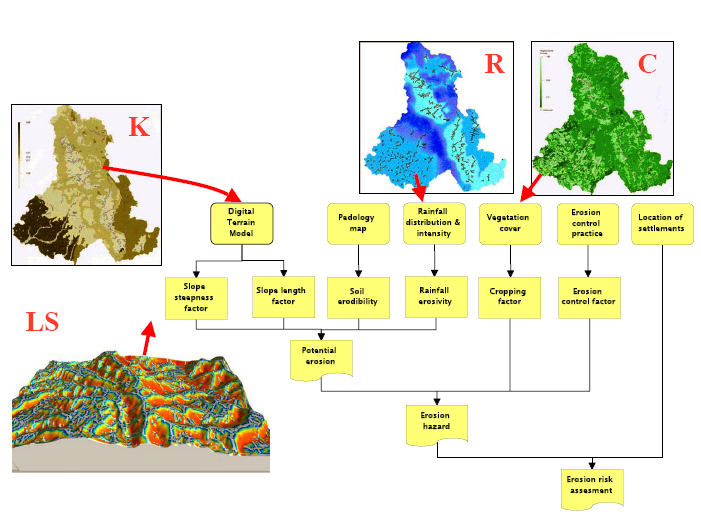 So we included rainfall data, soil data, crop and vegetation coverage (from CORINE) and programmed MapInfo to calculate the topographic factors.