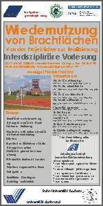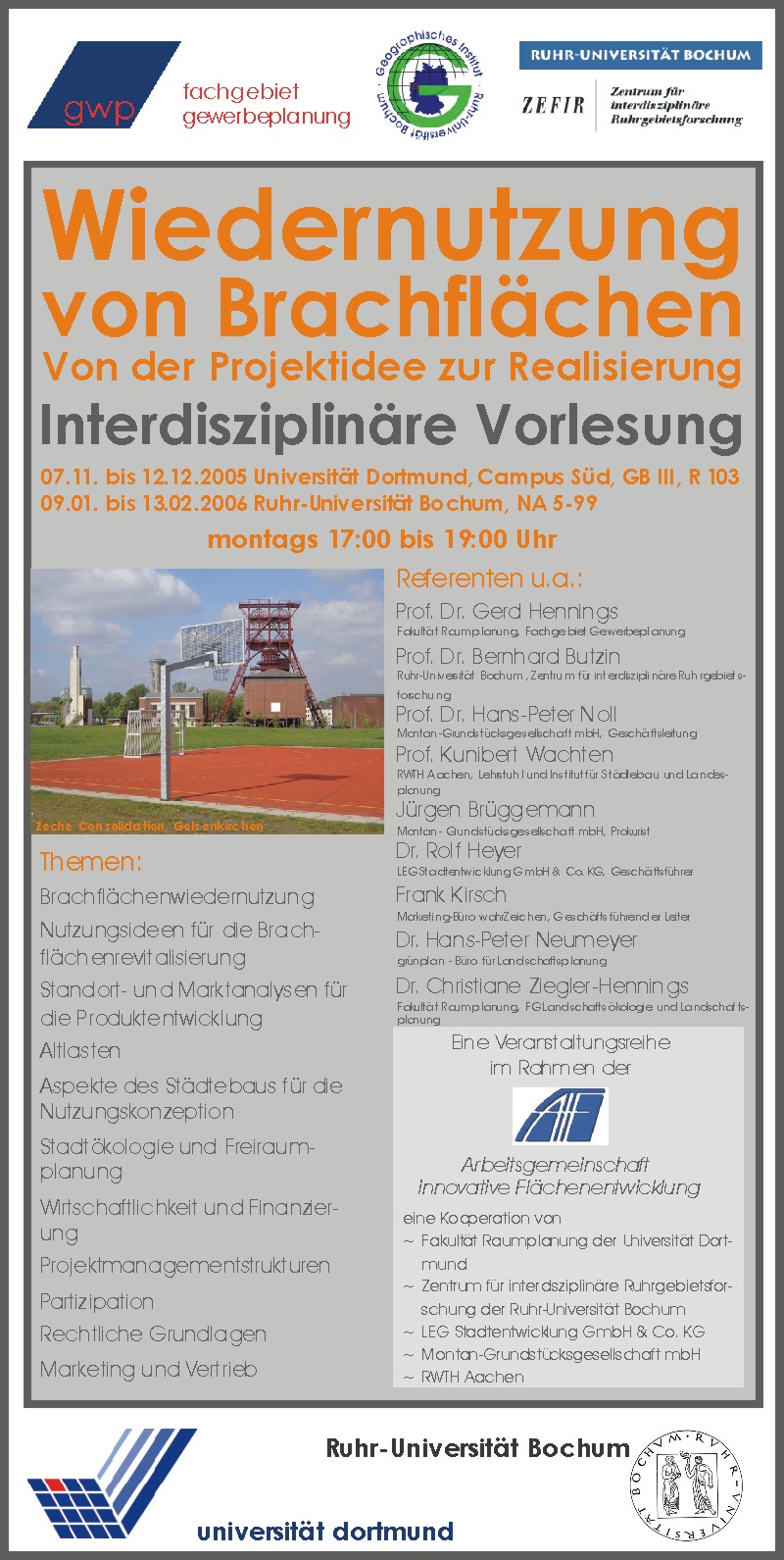 des Flächenrecycling angepasst werden müssen. Entsprechend des interdisziplinären Charakters des Flächenrecyclings kommen die Vortragenden aus den verschiedensten Disziplinen. Selten sind die unterschiedlichen Aspekte der Brachflächenwiedernutzung in so kompakter Weise im Rahmen einer Veranstaltung dargestellt worden. Veranstalter: AIF (Netzwerk mit den Partnern: MGG, LEG, Fachgebiete Gewerbeplanung sowie Landschaftsökologie und Landschaftsplanung der Fakultät Raumplanung (Universität Dortmund), ZEFIR (Ruhr-Universität Bochum), Lehrstuhl und Institut für Städtebau und Landesplanung (RWTH Aachen)) Die Veranstaltung findet jeweils am Montag