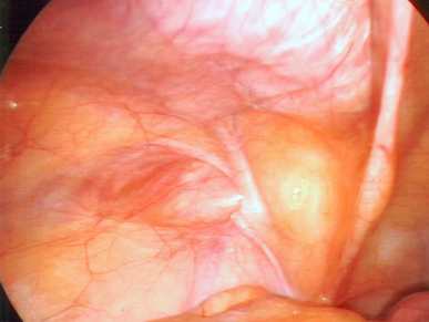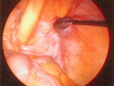 Laparoskop, die Zange weist auf die Bruchpforte |