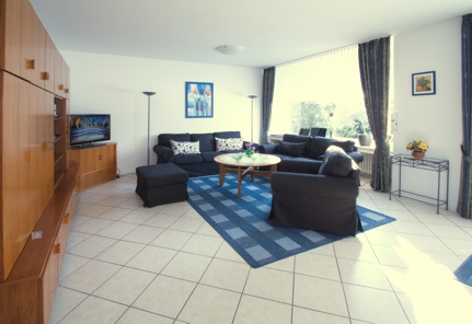 Die Erdgeschoss-Wohnung hat eine Wohnfläche von 75qm mit 2 Schlafzimmern, 5 Betten sowie einem Kinderbett, ein großes Wohnzimmer, eine Küche und ein Bad mit Dusche. Vom Wohnzimmer tritt man direkt auf die große Gartenterrasse. Das Wohnzimmer ist ausgestattet mit Fernseher und DVD-Player. Die Küche enthält eine Kühl-Gefrier-Kombination, einen Herd mit Ceranfeld und Backofen, Spülmaschine und Mikrowelle