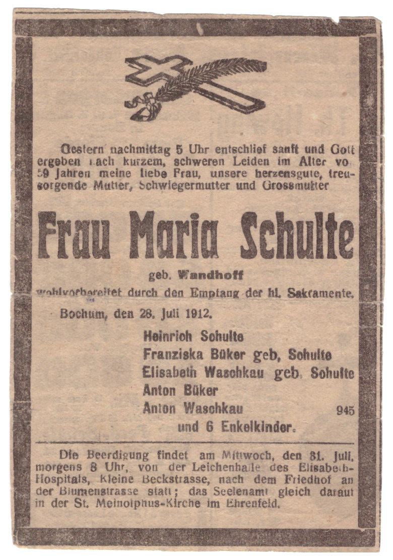 Maria* Carolina Wandhoff [Eltern] [Bild] wurde am 16. August 1853 in Bottrop geboren 1, 2. Sie erhielt am 17. August 1853 in Bottrop (kath.) die Kleinkindtaufe 3. Sie starb am 27. Juli 1912 in Bochum 4. Sie heiratete Jodoc Heinrich* Schulte am 1. August 1874 in Bochum 5.