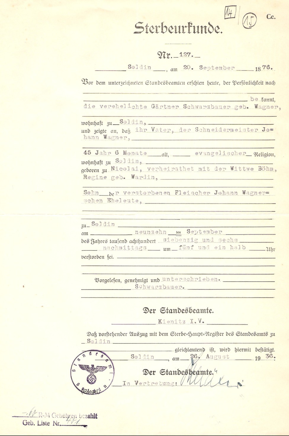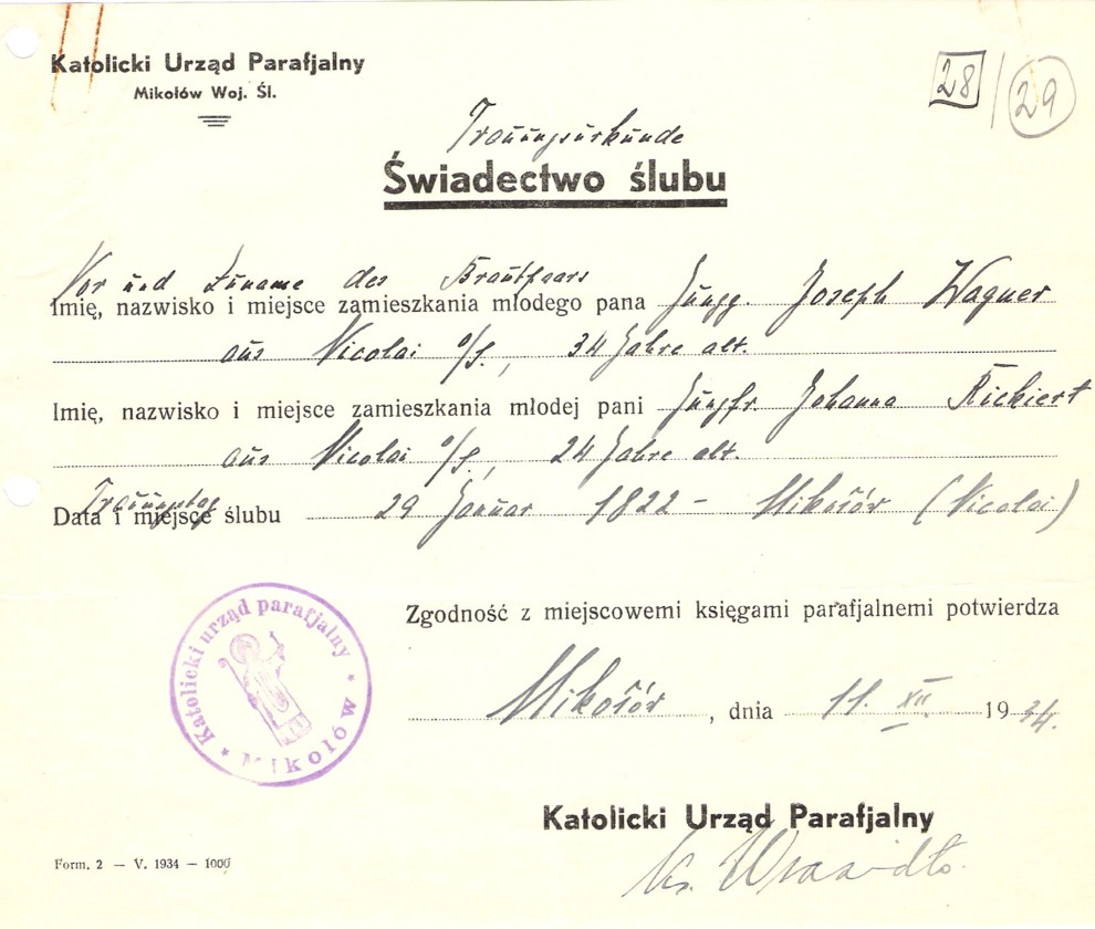 Johanna Rickiert [Eltern] wurde ungefähr 1798 in Nikolai (Kr. Rosenberg) geboren 1. Sie starb am 1. September 1866 in Nikolai (Kr. Rosenberg) 2. Sie heiratete Joseph Wagner am 29. Januar 1822 in Nikolai (Kr. Rosenberg) 3.