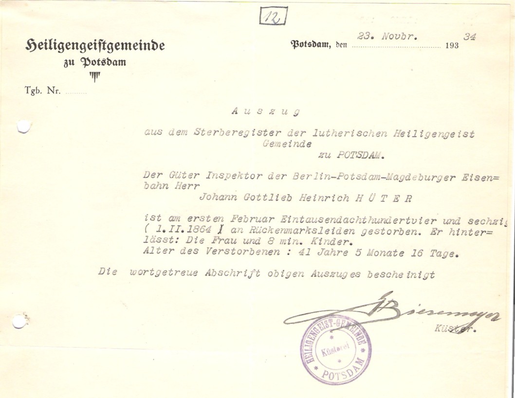 Johann Gottlieb Heinrich* Hüter [Eltern] [Bild] wurde am 16. August 1822 in Cammin geboren 1. Er erhielt am 25. August 1822 in Cammin die Kleinkindtaufe 2. Er starb am 1. Februar 1864 in Potsdam 3. Die Todesursache war Rückenmarksleiden. Er heiratete Christiane Luise* Beate Bock am 20. September 1846 in Berlin, St. Elisabeth 4. Er arbeitete 1846 in Potsdam als Kanzlist bei der Berlin-Potsdam-Magdeburger Eisenbahn. Er arbeitete 1852 in Brandenburg (Havel) als Güter-Expedient. Er arbeitete in Potsdam als Güter-Inspektor der Berlin-Potsdamer Eisenbahn.