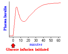 The figure to the right depicts the effects on insulin secretion when enough glucose is infused to maintain blood levels two to three times the fasting level for an hour. Almost immediately after the infusion begins, plasma insulin levels increase dramatically. This initial increase is due to secretion of preformed insulin, which is soon significantly depleted. The secondary rise in insulin reflects the considerable amount of newly synthesized insulin that is released immediately. Clearly, elevated glucose not only simulates insulin secretion, but also transcription of the insulin gene and translation of its mRNA.