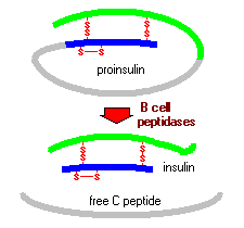 When the B cell is appropriately stimulated, insulin is secreted from the cell by exocytosis and diffuses into islet capillary blood. C peptide is also secreted into blood, but has no known biological activity.