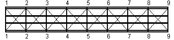 Aus dem Bild oben wird auch deutlich, dass die durch den Zug wirkende Last, die laut Schneider UIC 71 als Streckenlast anzunehmen ist, über die Querverstrebungen genau in die Knoten in den Untergurten der beiden Trapezfachwerke abgeleitet wird. Von daher haben wir in den eigentlichen tragenden Elementen durch die auftretenden Verkehrslast ausschliesslich Normalkräfte und keine Querkräfte und Momente. Die dennoch auftretenden Momente und Querkräfte können auf die Eigenlasten des Bauwerkes sowie evtl. auftretende Schneelasten zurückgeführt werden, die zwar als Streckenlasten anzunehmen sind, aber in den folgenden Betrachtungen zur Ermittlung der Stabkräfte im Fachwerk keine Rolle spielen und daher bei den folgenden Betrachtungen nicht berücksichtigt wurden.
